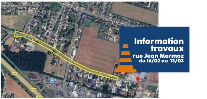 INFORMATION TRAVAUX – Rue Jean Mermoz Du 16 février au 13 mars 2026, des travaux de réhabilitation du réseau d’eaux usées auront lieu rue Jean Mermoz. La circulation sera fermée (sauf riverains) et le stationnement interdit sur la portion concernée, en semaine de 7h30 à 17h00.