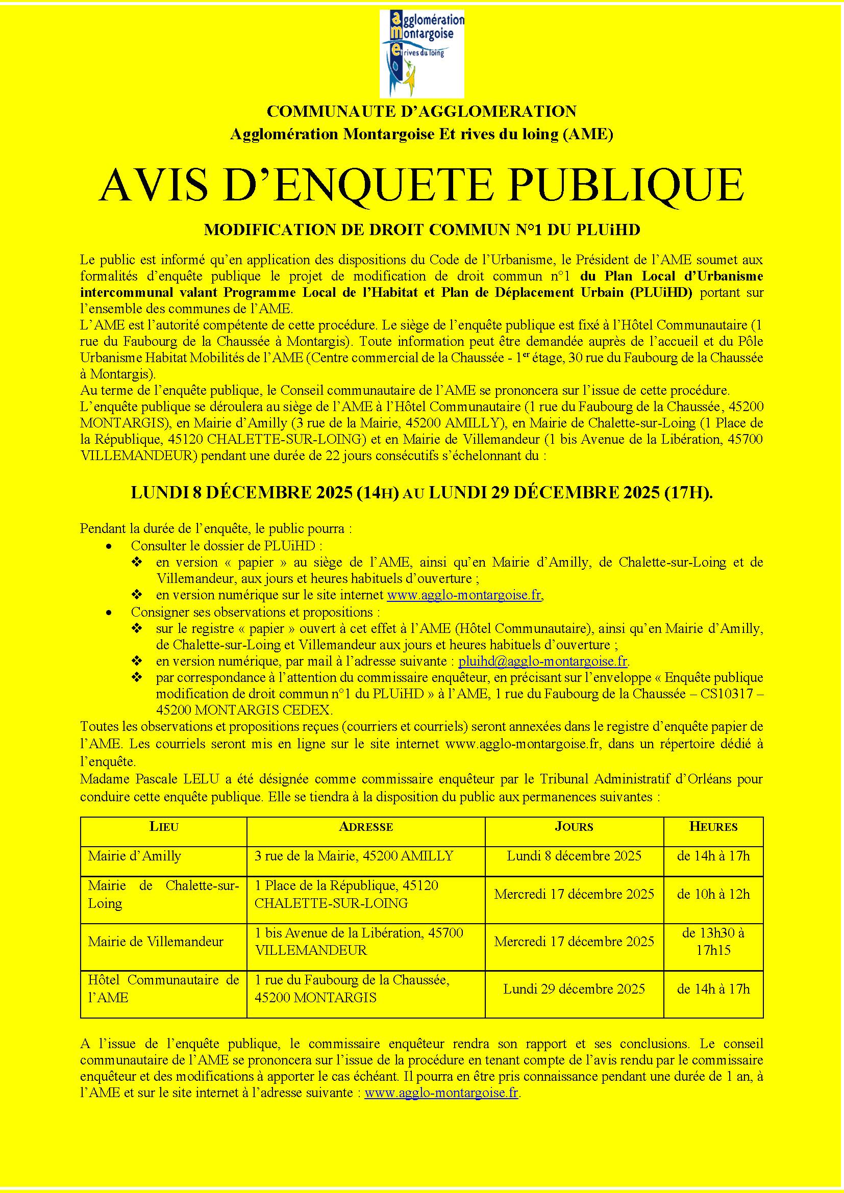 Par arrêté du 6 novembre 2025, le Président de l’Agglomération Montargoise a prescrit l’ouverture d’une enquête publique concernant le projet de modification de droit commun n°1 du PLUiHD sur les communes de l’AME.
